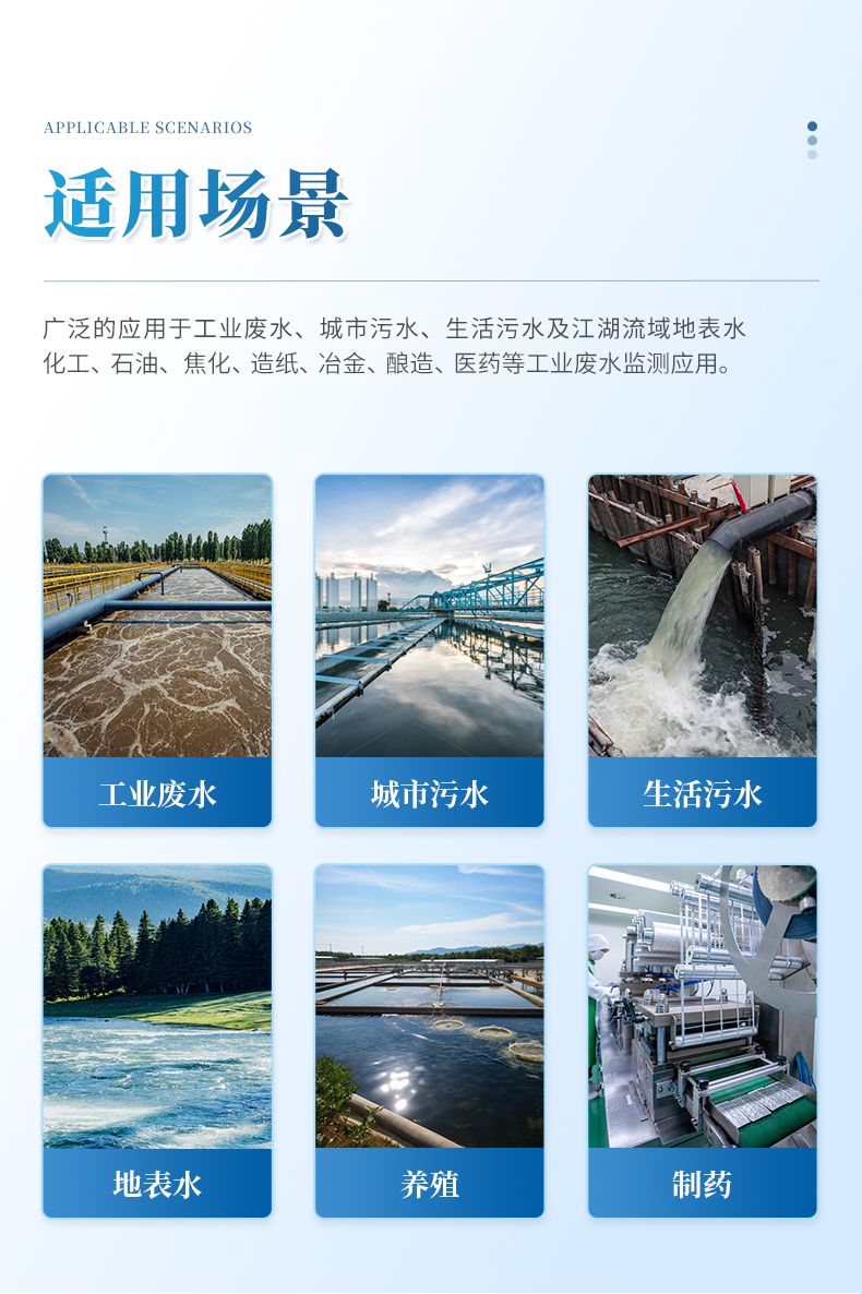 能夠廣泛的應用于各種行業(工業廢水、城市污水、生活污水及江湖流域地表水)廢水的檢測,可適合不同用戶的多種需求,可在化工、石油、焦化、造紙、冶金、釀造、醫藥等工業廢水及各種生活污水監測應用。
