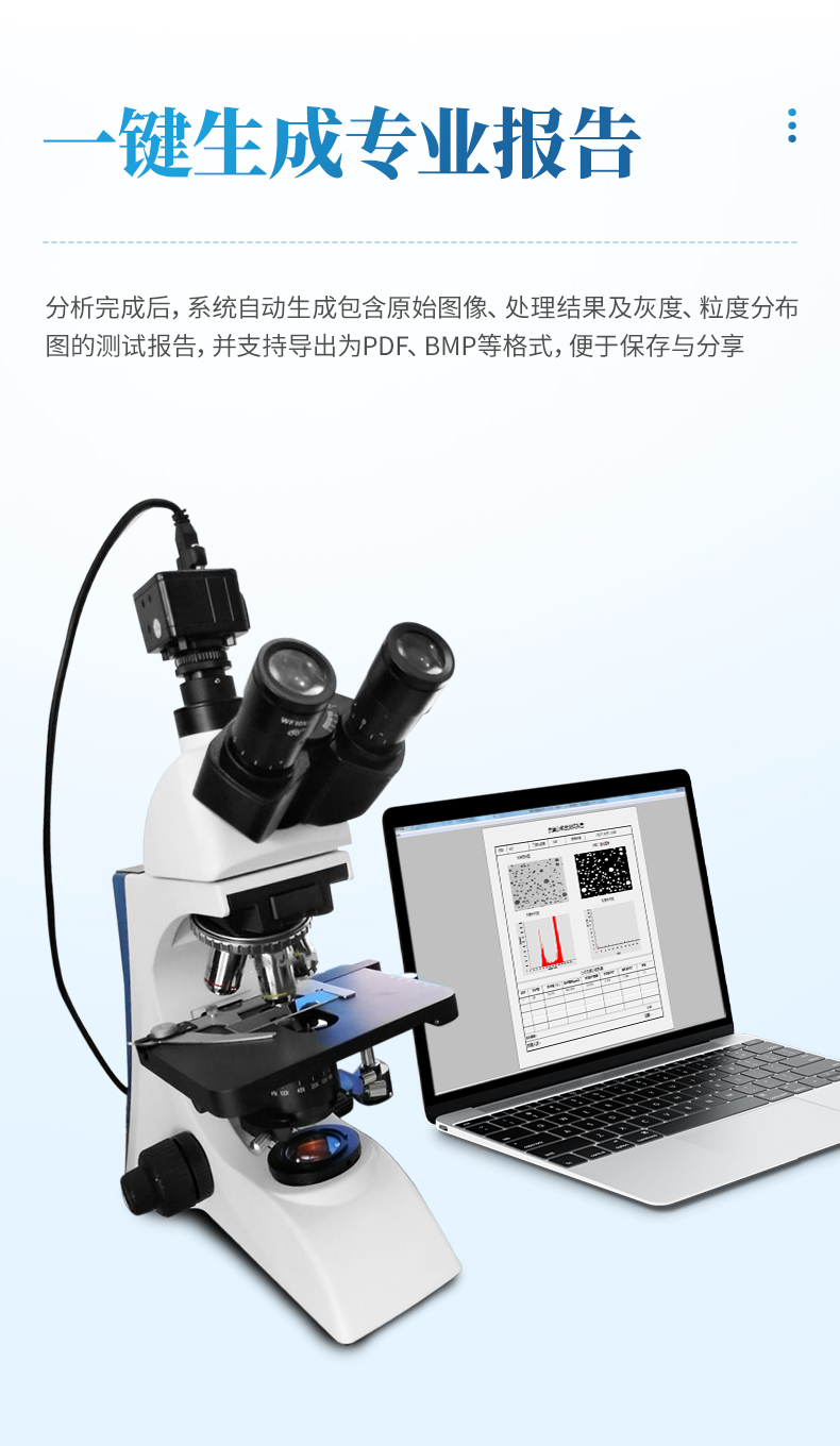 報(bào)告報(bào)告包括:樣品名稱、二值化閾值、參考標(biāo)準(zhǔn)、原始圖、二值化后圖像、灰度分布圖和粒度分布圖、軟件分析得到的項(xiàng)目參數(shù)等。如下圖所示: