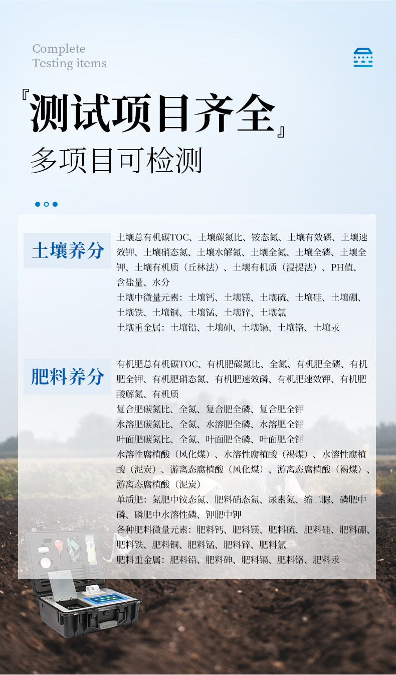 2、肥料養分:●有機肥碳氮比、全氮、有機肥全磷、有機肥全鉀、有機肥硝態氮、有機肥速效磷、有機肥速效鉀、有機肥酸解氮、有機質;●復合肥碳氮比、全氮、復合肥全磷、復合肥全鉀;●水溶肥碳氮比、全氮、水溶肥全磷、水溶肥全鉀;●葉面肥碳氮比、全氮、葉面肥全磷、葉面肥全鉀;●水溶性腐植酸(風化煤)、水溶性腐植酸(褐煤)、水溶性腐植酸(泥炭)、游離態腐植酸(風化煤)、游離態腐植酸(褐煤)、游離態腐植酸(泥炭);●單質肥:氮肥中銨態氮、肥料硝態氮、尿素氮、縮二脲、磷肥中磷、磷肥中水溶性磷、鉀肥中鉀;●各種肥料微量元素:肥料鈣、肥料鎂、肥料硫、肥料硅、肥料硼、肥料鐵、肥料銅、肥料錳、肥料鋅、肥料氯;●肥料重金屬:肥料鉛、肥料砷、肥料鎘、肥料鉻、肥料汞。