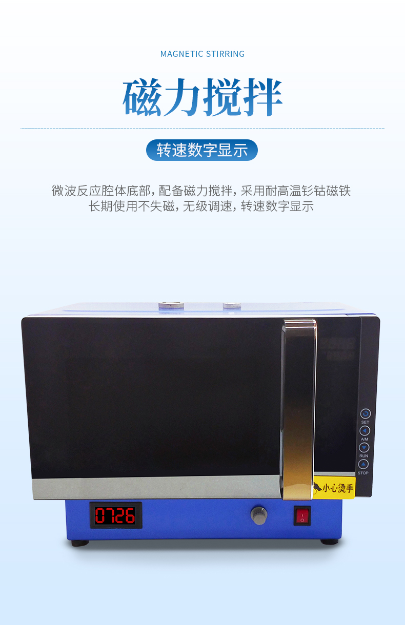 微波反應(yīng)腔體底部,配備磁力攪拌,采用耐高溫釤鈷磁鐵,最大工作溫度可達(dá)350℃,長期使用不失磁,無級調(diào)速,轉(zhuǎn)速數(shù)字顯示。