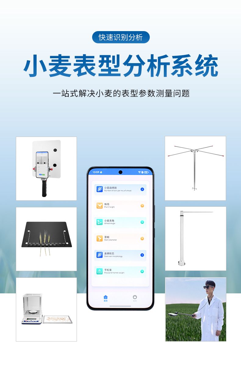4)麥穗形態測定儀依托手機視覺技術,通過AI圖像矯正算法一鍵獲取穗長、小穗數等關鍵指標。全系統實現田間快速取樣、批量分析及數據互聯,為育種優化、產量預測和功能基因解析提供智能化解決方案。