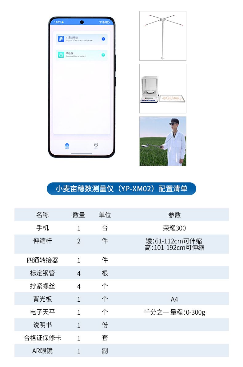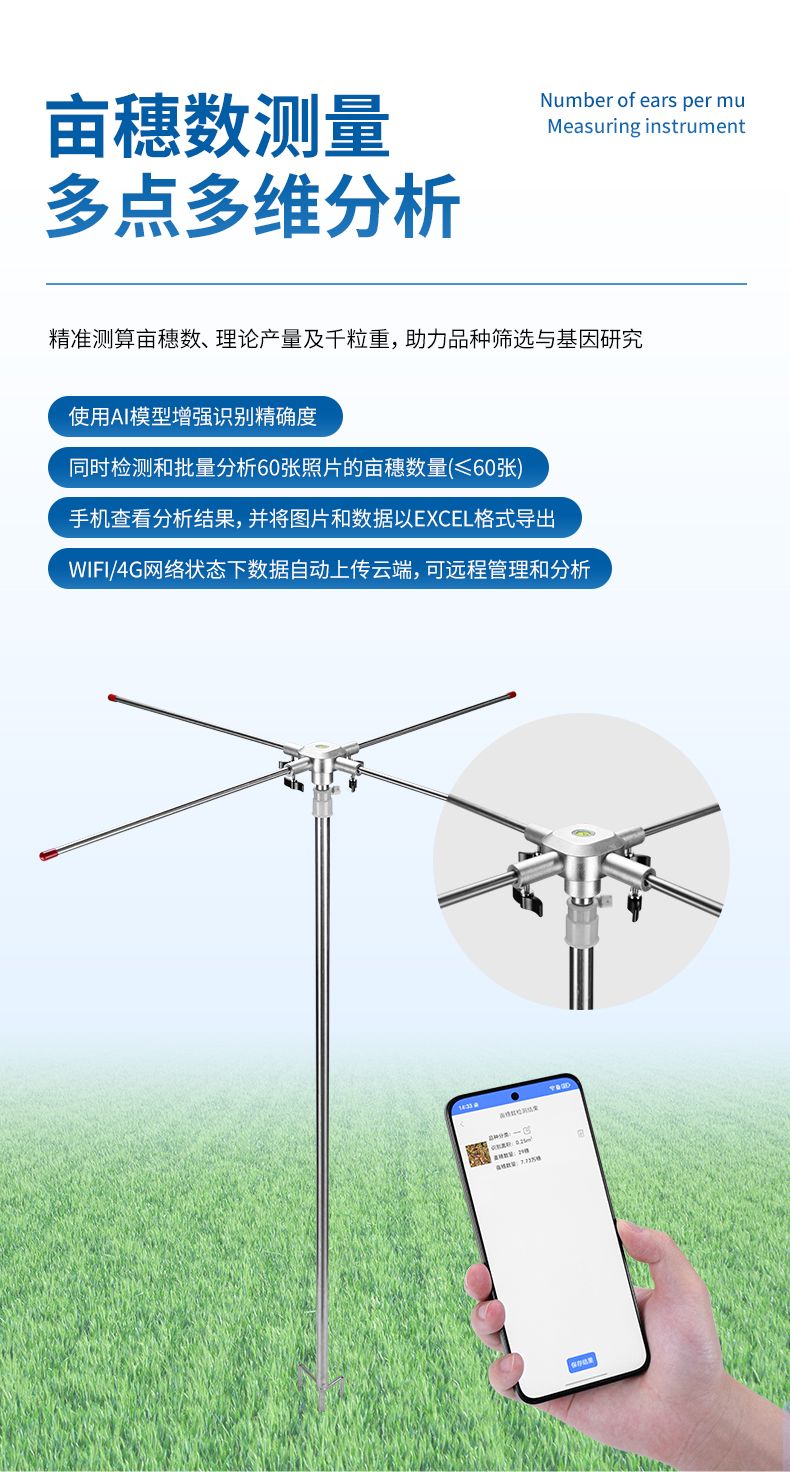1)畝穗數測量儀通過多點多維分析,精準測算畝穗數、理論產量及千粒重,助力品種篩選與基因研究;