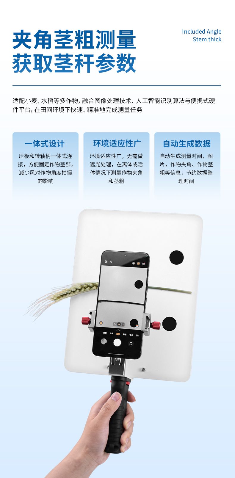 3)夾角莖粗測量儀適配小麥、水稻等多作物,快速獲取莖稈形態參數;