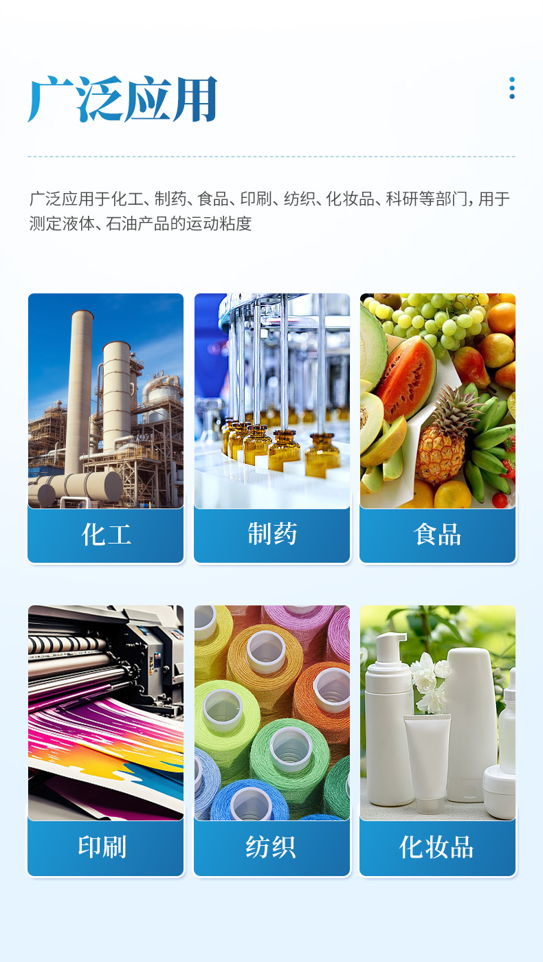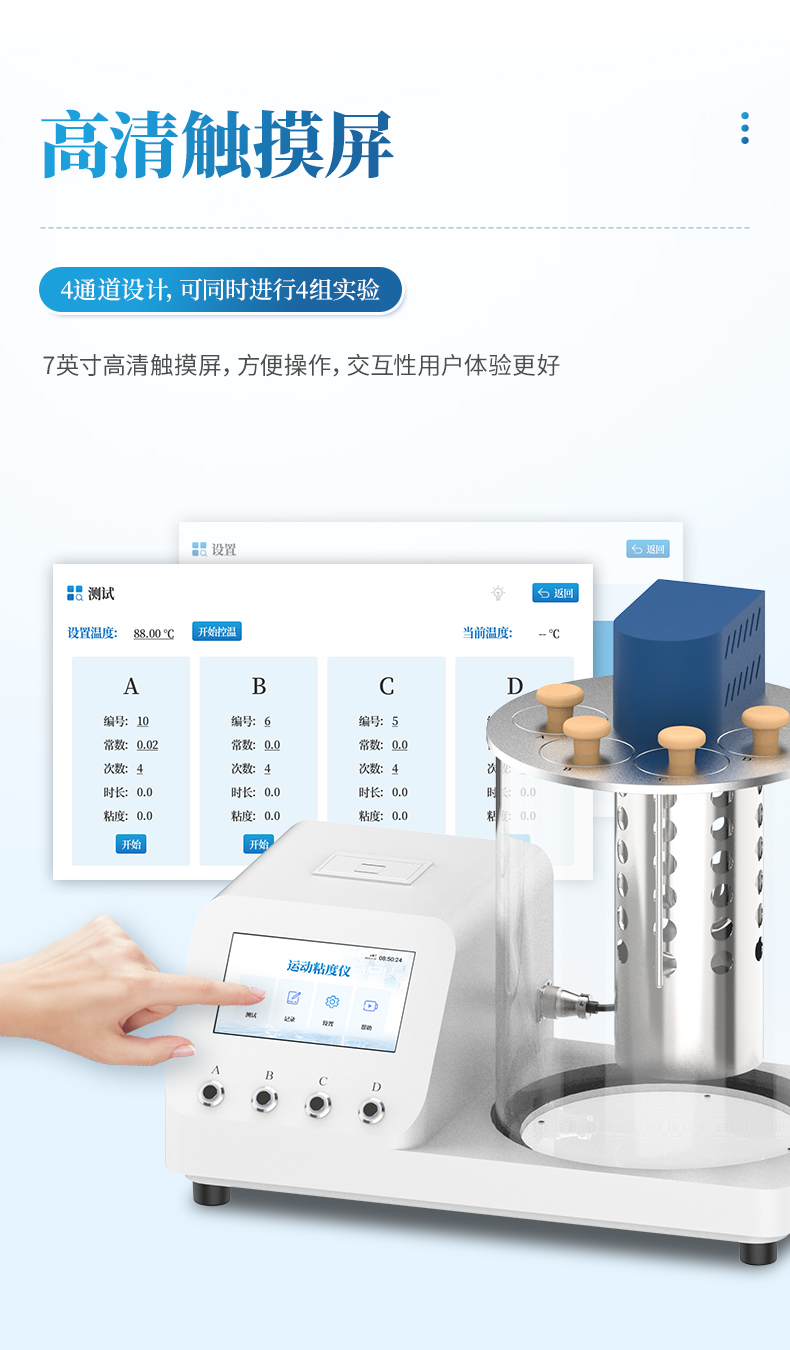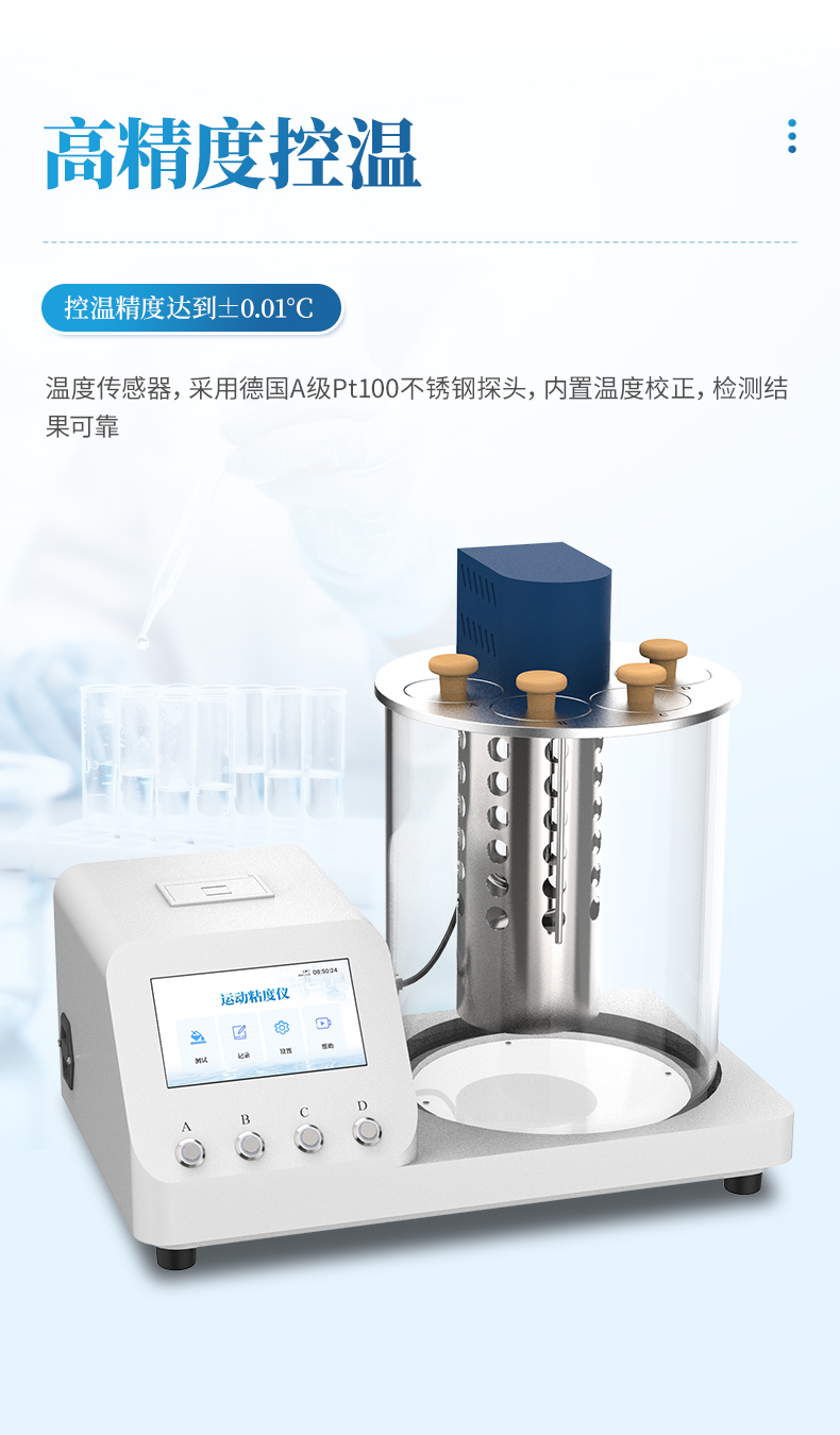 本產品石油產品運動粘度自動測定儀是依據國家標準《GB265-88石油產品運動粘度測定法》設計制造的專用測試儀器,適用于測定液體石油產品的運動粘度。本儀器具有計時試樣運動時間,自動計算運動粘度的最終結果。本方法適用于測定液體石油產品(指牛頓液體)的運動粘度,其單位為m2/s,通常在實際中使用為mm2/s。動力粘度可由測得的運動粘度乘以液體的密度求得。本方法是在某一恒定的溫度下,測定一定體積的液體在重力下流過一個標定好的玻璃毛細管粘度計的時間,粘度計的毛細管常數與流動時間的乘積,即為該溫度下測定液體的運動粘度。該溫度下運動粘度和同溫度下液體的密度之積為該溫度下的動力粘度。