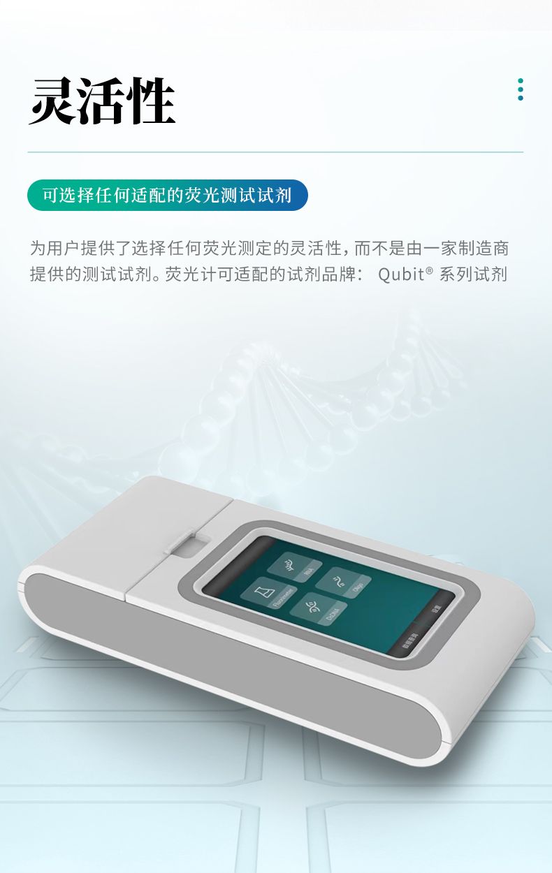 5. 靈活性---為用戶提供了選擇任何熒光測定的靈活性,而不是由一家制造商提供的測試試劑 熒光計可適配的試劑品牌: Qubit? 系列試劑.