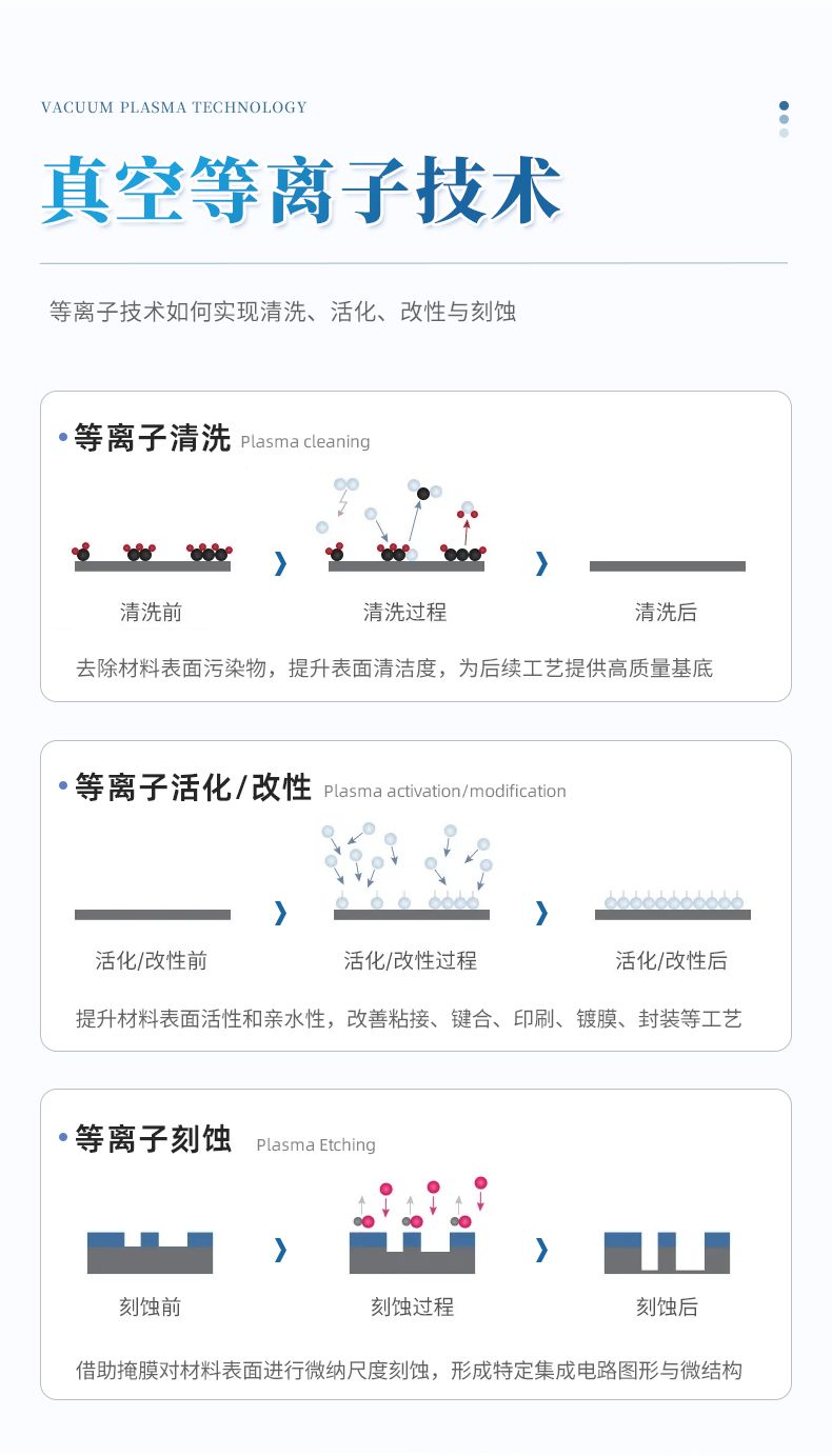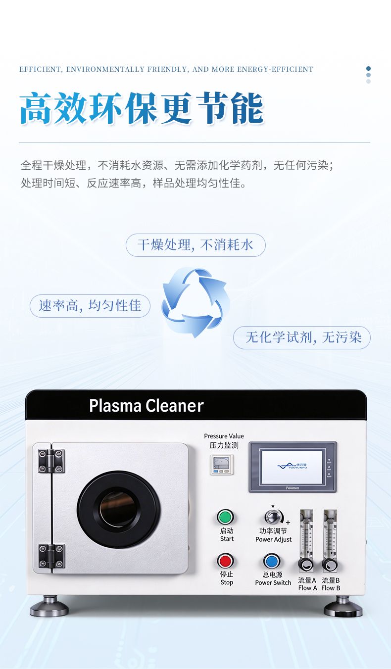 對氣體施加足夠的能量使之離化便成為等離子狀態。等離子體的"活性"組分包括:離子、電子、活性基團、激發態的核素(亞穩態)、光子等。等離子體表面處理儀就是通過利用這些活性組分的性質來處理樣品表面,從而實現清潔、改性、
